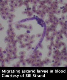 During its travels, an ascarid can produce reactions in the liver and the lungs that can pave the way for opportunistic microflora. Because of their large size they can affect mobility of the gastrointestinal tract. Fenbendazole works well against adults, but not against other stages as it does not get to the blood, liver, or lungs. After treatment, the dead bodies of the adults may be seen in feces. Because Fenbendazole works slowly it may take a number of days for the worms to be ejected. Worms weakened by the drug, but not killed may resist peristaltic action for a time.
