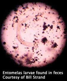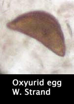These nematodes feed on carbohydrates mostly in the small intestine. They start their life as eggs expelled from their host in feces. Pinworms have a direct lifecycle so the eggs wait to be ingested by another (or the same) host. This will most likely occur through a food item that hashad contact with the feces of the chameleon. Once the host (in this case, a chameleon) ingests them, the eggs stay in the stomach until they hatch. Their small size keeps them from being forced into the small intestine. The hatched larvae are free swimming and make their way to the small intestine where they will grow by ingesting the carbohydrates that are meant for the chameleon. In the small intestine they mature, mate, and die. Gravid females will swim past the sphincter into the large intestine. Here they will lay their eggs. Pinworms are detected by visual inspection of the feces where .5cm (0.2in) females may be seen or by spotting eggs via microscope aided fecal analysis. Fenbendazole is effective against the larvae in the small intestine and somewhat effective against the females in the large intestine. The females in the large intestine may escape the drug if they have embedded themselves in the feces. Pinworms are not directly dangerous unless they are in high concentrations.