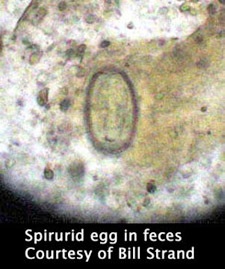 Spirurids are detected by eggs in feces under a microscope. They are double-walled X with four tubercles and a well developed larvae.