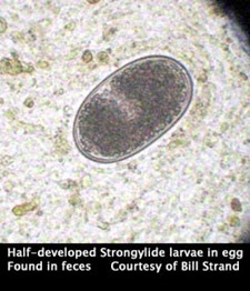 This is the group that hookworms belong to. Lifecycle is similar to hookworms. The only difference is that other strongylides cannot burrow into skin and are not blood feeding. They produce moving larvae and eat mucus and food/tissue nutrients. They are detected by eggs or well-developed moving larvae under the microscope. In feces two or three days old the eggs will have hatched and only moving larvae will be seen.