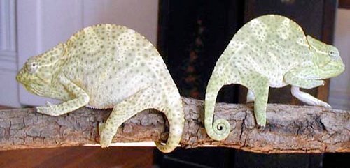 These juvenile Chamaeleo deremensis are growing at different rates. The different growth rates reflect differences in daily calorie needs and metabolic rates. As a result, their calcium needs vary also. The larger chameleon on the left will eat more calories and need more calcium than the smaller chameleon on the right.