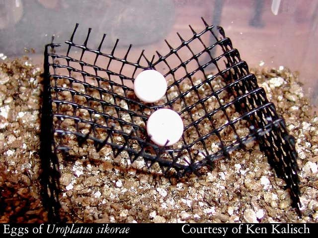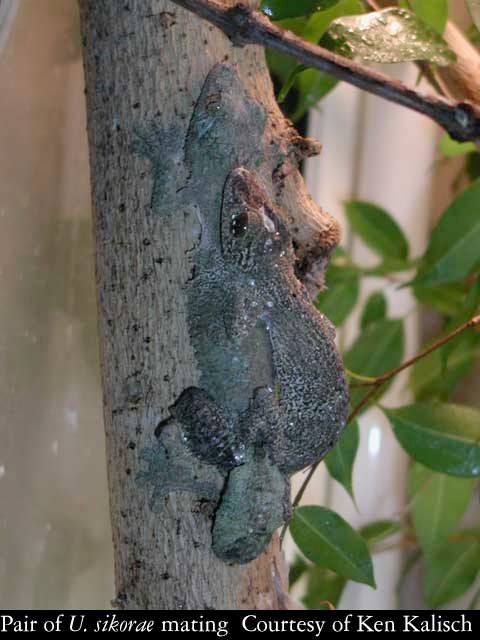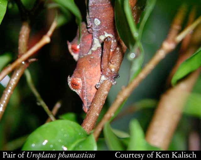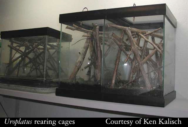 The uroplatus sikorae were by far my favorites. I purchased a group of 2:3. They were set up in a tall Plexiglas/screened cage. The cages dimensions are 2' W x2' D x 6' H (.609 m- W x .609 m- D x 1.8288 m- H ). It was filled with Ficus benjamina, bromeliads and lots of vertical sloping branches. The lighting was a combination of halogen spotlights and 3 - 24" fluorescent fixtures with Reptisun 5.0 ®bulbs.