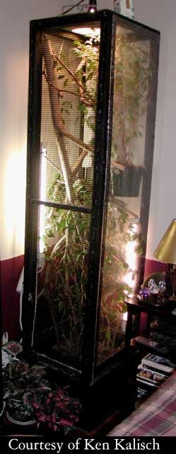 The first thing I had to come to terms with was how to house them. I had always used all-screened cages with my chameleons, so part of me was conflicted with the recommendations of using all-glass caging. Because I did have some reservations with an all glass cage, I compromised with three sides Plexiglas with the front and top made of plastic screen. This was the first of several challenges I faced in converting my "chameleon knowledge" to the uroplatus. Much of the chameleon basics translated well, the use of living plants as well as branches and the proper lighting. I did have to rethink the cage setup in general. They would need vertical branches that would allow them a place to rest upon as opposed to the foot/grip issue with chameleons. This also meant that the branches would need to have a much larger circumference than with the chameleons. The other and most obvious was that the uroplatus were nocturnal and the chameleons were diurnal. The watering application was the same as with the chameleons, a combination of a dripping source and misting the cage several times a day, but the time it was done was changed to early mornings and the evenings, after the lights went out. Their feeding times were also opposite, as well as an increase in the amounts of supplemented calcium in the geckos diet. Everything came together and I was ready for the lizards.