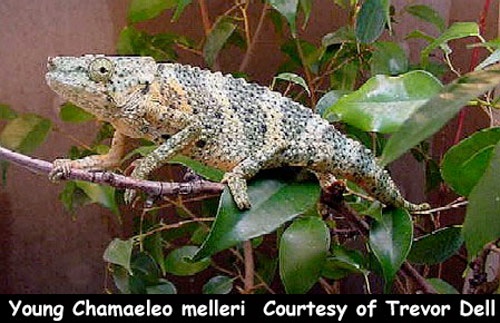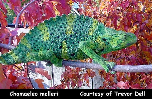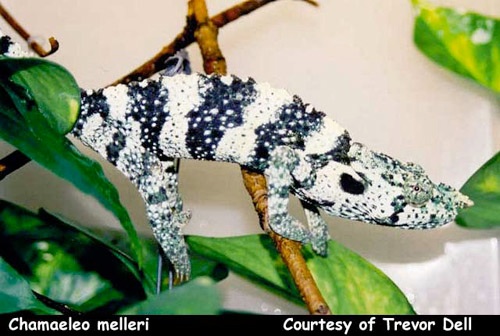 Chamaeleo (Triceros) melleri, the largest chameleon found in Africa was described in 1864 by Dr. J. E. Gray. C.melleri is one of three chameleons that are considered the true giants of chameleons. The other two contenders in the largest species race are from the island of Madagascar. They are Calumma parsonii and Furcifer oustaleti, both reaching up to 24"(609 mm) and on a rare occasion C. parsonii has been recorded at 29"(736mm) making it the clear winner of the largest size contest.