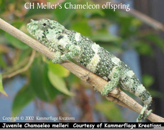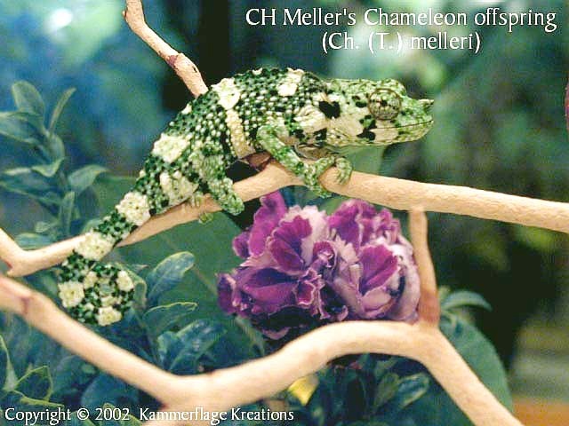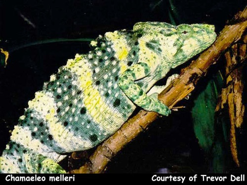 The size range of Chamaeleo melleri adults average around 18" to 24" TL (457mm to 609mm), with a weight that falls in the respective range of 225grams to 450grams. The overall typical coloration is a bright green and yellow that forms vertical banding sprinkled with spotting of yellow, green and occasionally black that consists of large flat granular scales. There are color variations that range from an all over green to a gray-green in coloration and as in other species of chamaeleo sp. the variations are tied to locality as we have seen well documented with the many color morphs of Furcifer pardalis.