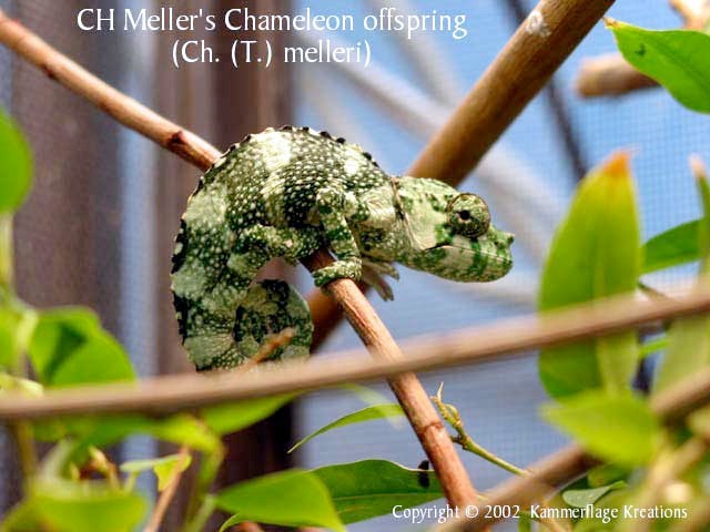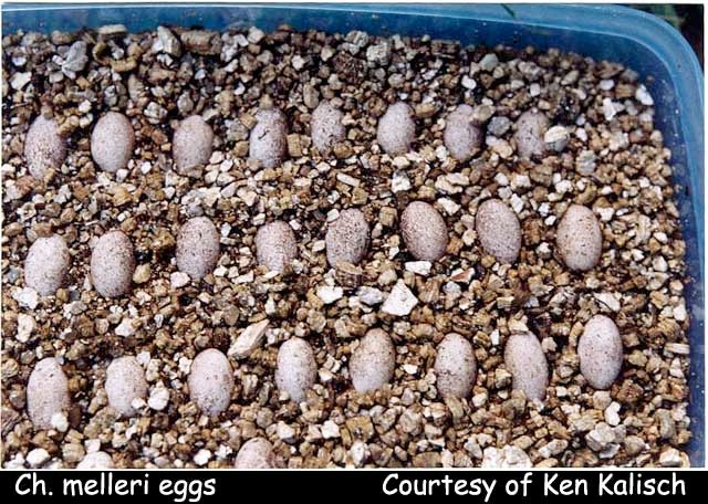 In captivity it is essential that C.melleri be provide with a stress free living space. This is not a species that will do well in cramped or crowded conditions in part because this species seems to have a very poor tolerance for stress. The most successful captive situations have been those that provide a very large well-planted enclosure. Melleri can be fairly active and aggressive (see info in the Melleri Myths article), and need to be provided space to move about freely and to have space for each to move away (both visually and literally) if one becomes aggressive towards another. Let me just say the cage couldn't be too big. I have kept a pair of adults in an indoor cage 3' wide x 4' deep x 7' (91 cm x 121 cm x 212 cm), they were provided with many large Ficus benjimina trees and branches for perching, as well as several basking and UVB fluorescent lights. The humidity was supplemented with a cool mist humidifier that was on a timer for10 hours a day. The pair co-habituated well year round with the only indications of stress/aggression shown was during the time they were breeding, which occurred in December/January.
