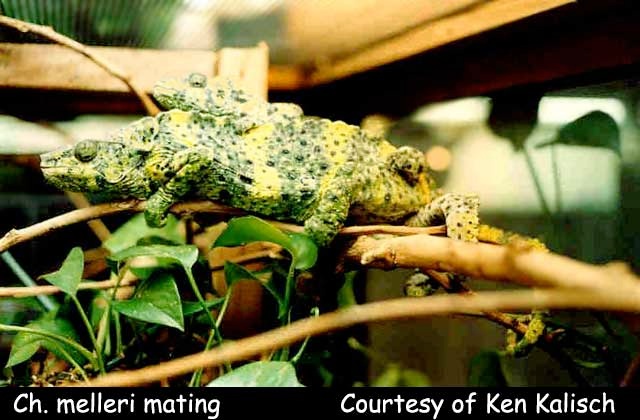 Even the Melleri's process of courtship and reproduction has an interesting level of activity. They display to each other by raising and flicking their occipital flaps, flaring their gular and rocking their body from side to side. I have even observed them charging each other in what appeared to be a courtship test of wills. Mating takes place in the typical chameleon fashion with the female lifting up her tail as the male climbs onto her back. Copulation may last from 10 to 20 minutes. Their coloration went through several dramatic changes (especially for the male) as he courted the female who went from his usual yellow green pattering to a brilliant display of yellows, blacks and cream. The female's coloration was fairly stable throughout courtship and copulation but when the copulation ended she clearly let the male know that she was not interested in any further interaction by turning an overall dark, almost black in coloration. The period of receptivity for breeding can last up to a month. I observed several copulations between the same breeding pair over a three-week time frame. In the situation I had my pair in, I allowed them to continue to co-habituate but this may not always be the preferred choice and needs to be dictated by the chameleon's compatibility and cage size