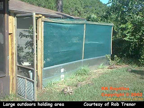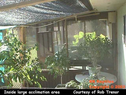 After they have received the second shower, each animal receives a dose of Nutri Bac DF® as well as their first dosage of Pancur. Nutri Bac is given to help replenish any natural bacteria in the intestinal system that might be depleted during the de-worming process. Panacur is given to kill and eliminate and internal parasites. I dose them on the first dose of Pancur to start the process of eliminating internal parasites. After this treatment they all receive another long warm shower. I use high UVB Fluorescent bulbs on their Reptariums® to give them the required UV rays. I offer them more items of food at that time in case they are hungry. I give them at least 5-6 showers like that every single day when in my care. I house them in the 250 gallon Reptariums® when I am unable to allow them free roam in my outdoor enclosure. My outdoor enclosure measures, 22 feet wide, 17 feet deep, and 12 feet tall in the rear and 9 feet tall in the front. I have an automatic misting system set up that mists the entire enclosure for 30 minutes 6 times per day. I have large live trees in the enclosure as well as some bushes to allow them to feel as comfortable as they can. The entire enclosure is enclosed with green-style shape cloth, and half the roof is covered with black shade cloth. The other half of the roof in plastic screen with 1⁄2" squares. I have tin panels on the bottom of each wall imbedded into the ground about 6-8" to ensure outside animals (i.e. raccoons, opossums, etc.) can not get into the enclosure. I have found that C. melleri acclimate and do so much better in captivity if when they first arrive are given an opportunity to feel comfortable and feel safe in similar conditions as they would find in the wilds of Tanzania. I house them at temperatures of 72-86 degrees F. when they are housed indoors, and house them outside when I know the temperatures will not exceed the high 90's. They do not seem to tolerate higher temperatures very well. They can handle it, but I can tell they are not happy unless the temps are closer to the high 70's. When the temps get to high, the animals become very lethargic and turn very dark, showing that they are unhappy and becoming stressed. When the temps are in the high 70's the animals show nice light green & yellow coloration, are very active in exploring the enclosure and generally show no signs of stress
