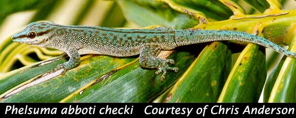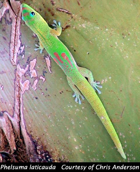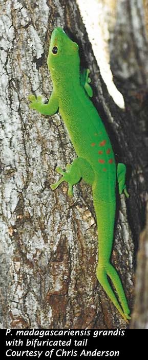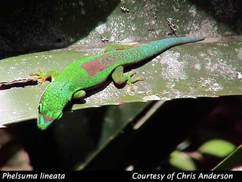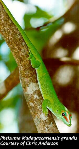 And, before you start thinking about setting up a mixed species environment, be advised that chameleons regularly prey on Phelsuma in the wild. Of course there have been a few folks who keep one of the larger species of Phelsuma with a smaller or midsized chameleon, but most knowledgeable herpetologists recommend against it. You should also realize that Phelsuma are very quick and will escape from their enclosures quickly if you aren't paying attention. With their breakaway tails (they will grow back, but never as nice as the original) and their fragile skin, they are display animals not animals to be held and displayed from your hands.