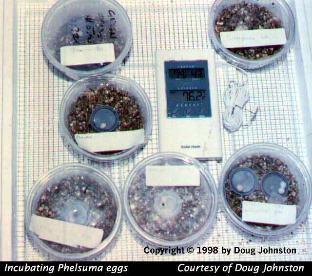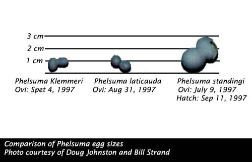 If you intend to breed your Phelsuma, make sure you have egg laying sites in the enclosure. Phelsuma lay two eggs in a clutch. Eggs are often visible within the female's abdomen just prior to laying. The eggs exit the female's body relatively soft and pliable. She will then hold and shape the egg until it hardens. The second egg is then laid against the first, resulting in them being bonded together. They will often lay them at the base of bromeliads or in the interstices of vertically oriented plants. They will also lay in bamboo tubes if supplied. I've even had a couple P. lauticauda (Gold Dust day gecko) dig and bury their eggs in the tank substrate. There are a few species that are "egg gluers", cementing their eggs to a surface where they must remain until they hatch. Since most Phelsuma will view new hatchlings as potential food, it is wise to remove the eggs and incubate them. Glued eggs should be protected if possible by taping a small plastic box over and around them. There should be some moist sphagnum moss in the box. I've incubated eggs very successfully by placing them on film canister tops resting on moist (but not wet) vermiculite in a deli cup with a few pin holes punched in the top. The eggs should not be placed directly in the vermiculite. I only add water if the vermiculite has completely dried out. I usually incubate at 80F constant in a Hovabator type incubator. There is evidence that incubation temperatures drive the sex of the resultant hatchling. However, varying the incubation temperatures between 77F and 85F should result in an even distribution of male and female hatchlings. Depending on species and incubation temperatures, fertile eggs should hatch in 38-90 days. Most females will lay a clutch every 3-4 weeks. Supplying a small dish of plain calcium during the breeding season will help the females with their bodily needs.