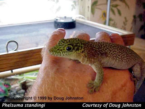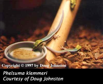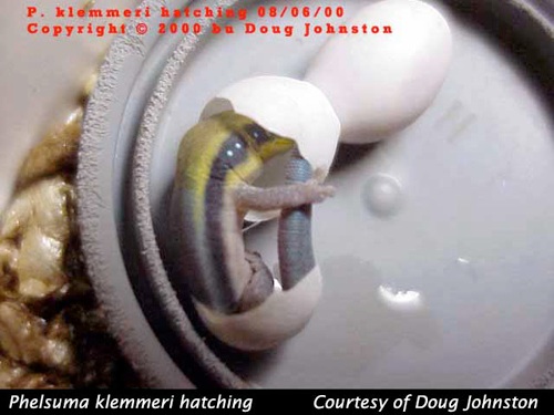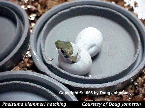 Some breeders feel that hatchling Phelsuma are extremely sensitive and treat them very carefully the first few weeks of their lives. I've found them to be very hardy generally and tend to treat them just like I do the adults. I do place them in smaller planted enclosures and feed them with appropriate sized prey, but otherwise they are treated just like the adults. When new hatchlings are found in the incubator, I transfer them carefully (they are tiny!) to their enclosures. I usually house clutch mates together for the first couple months (keep an eye out for aggression and different growth rates. It's rare, but does happen). I supply them immediately with a small dish of fruit baby food mixture. I also place a small number of pinhead crickets and/or flightless fruit flies. Too many prey insects can stress the hatchlings and they won't eat. Larger species will start with larger insects, of course. You will be amazed at how fast Phelsuma grow! Many species reach sexual maturity at 6 months or so, but I usually don't breed them until they reach close to a year of age.