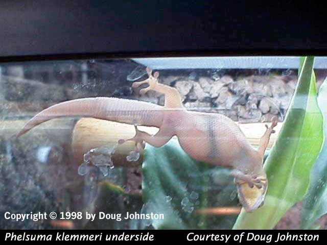 Lizards of the genus Phelsuma, commonly called day geckos, all lack eyelids. They all have toe pads, consisting of tiny lamellae, which can fit into irregularities on almost any surface. This makes it possible for them to easily climb any surface, including glass. There is little sexual dimorphism in most species; the males can usually be identified by their well developed femoral pores. Unlike most other members of family Gekkonidae, day geckos are diurnal (active primarily during the day). Most Phelsuma are about 4 inches to 5 inches in total length, but there are a few species that are smaller. There are even a few species whose total length reaches about 12 inches.
