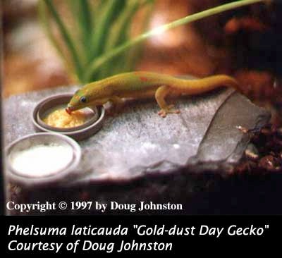 Obtaining quality Phelsuma can be a trial. There are several species still exported from Madagascar. Pet stores, if they have any Phelsuma at all, might have P. lauticauda (Gold Dust day gecko), P. lineata (Lined day gecko) or P. quadriocellata (Peacock day gecko). Most often these animals are wild caught (wc), not in the best of shape and can be difficult to acclimate. Their survival is questionable, even for experienced keepers. Specialty reptile stores will sometimes carry larger species such as P. standingi (Standings day gecko) and P. madagascariensis grandis (Madagascar giant day gecko). Not easy to find, but one of my personal favorites is P. klemmeri (Yellow-headed or Neon day gecko). I always recommend you obtain captive bred (cb) Phelsuma from a reliable breeder. Regardless, new animals should be quarantined from your other animals for at least 30 - 60 days, and then introduced carefully.