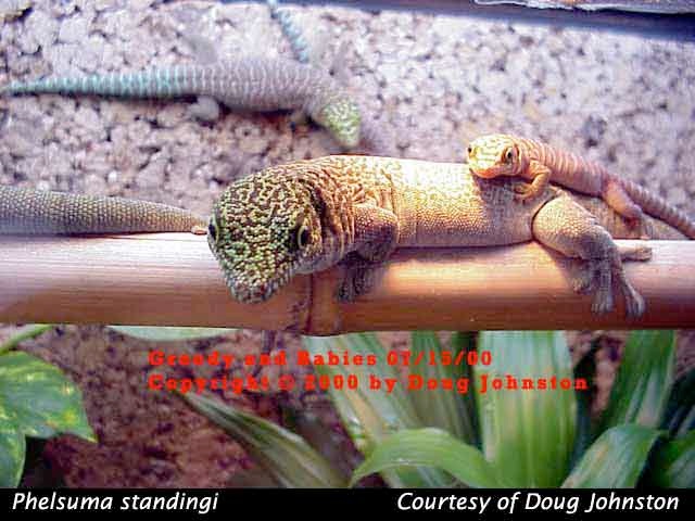 I'm a relative newcomer to the world of reptile keeping and breeding. I started in 1996 (at my wife's urging), and soon developed an interest in Phelsuma, moving quickly into chameleons. Phelsuma fascinated me because these lizards that the late Sean McKeown dubbed "the living jewels of the islands of the Indian Ocean" were active and some even seemed curious of activity outside their enclosures. I still raise both chameleons and Phelsuma. With success keeping and breeding both, I've had offspring into F2 and even F3 in a couple cases. Any chameleon keeper will find that the techniques that allow them to keep chameleons successfully can be easily modified for Phelsuma.
