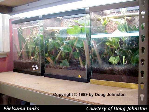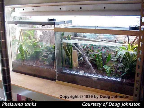 Phelsuma kept in captivity are typically kept in vertically oriented glass tanks, with screen tops, in the US. They also thrive in screen or mixed cages of glass/plastic and screen. The typical vivarium I build has potting soil substrate with live plants planted in it, with a thin layer of medium or fine orchid bark covering it. I like to use sansevaria, pothos, corn plants and others. Cork bark and live moss also make for nice decorations. For some excellent examples of vivaria suitable for Phelsuma, check out some of Rex Searcy's columns in Reptiles magazine. There are also good examples in the books referenced below. The more space you can give your Phelsuma, the better off they will be. However, pairs of the medium and smaller species do very well in 20 gallon tall tanks.