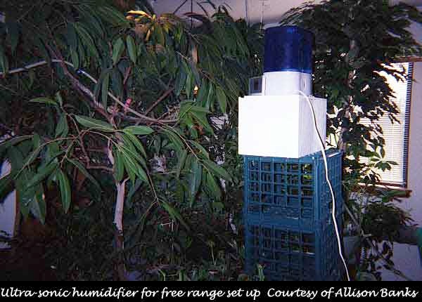 I found I still needed additional moisture in winter when the forced air furnace ran. At 9200 feet elevation during our single digit temperature winters this house hovered around 20% relative humidity if left alone. The very efficient RainMaker would flood the room trying to maintain 75-80% air humidity, so my next task was an ultrasonic humidifier for the forest. I stacked inexpensive plastic crates into a tower on one side of the dell and set a $40 Sunbeam model 696 on top. I aimed the mist with 2" diameter PVC water pipe up over the trees and watched fog pour down into the forest beautifully. A multiple setting lamp timer could control the humidifier as well.