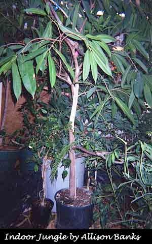 First, to keep the forest off my carpet I put a sheet of exterior grade plywood on low casters in the center of the room. The whole forest could be moved if needed. I covered this with an oversize piece of poly tarp or pond liner material leaving the excess loose around the sides. Next, I placed large potted plants on the tarp around the edge of the plywood and rolled up the excess tarp around the outside of the pots. This formed a sort of forest swale or dell in the center, but kept air moving underneath. I used Ficus alli and large overgrown schefflera plants and added height to them by setting the pots on plastic crates. You'll have better luck finding this Ficus species at larger nurseries that sell ornamental trees and tropical foliage plants. Sometimes you can get a good deal on an overgrown lanky schefflera from warehouse home improvement stores too. Check moving sales for houseplants too. Many plants that folks don't want to move are huge! Citrus trees, palms and Hibiscus work, but will need bright focused light. I know we all laugh at those fake Ficus trees at Wal-Mart, but they are great for this setup! To give the chameleons travel paths around their forest (which also helps them decide to stay around) I connected the plants with natural barked tree branches held firm with light gauge wire.