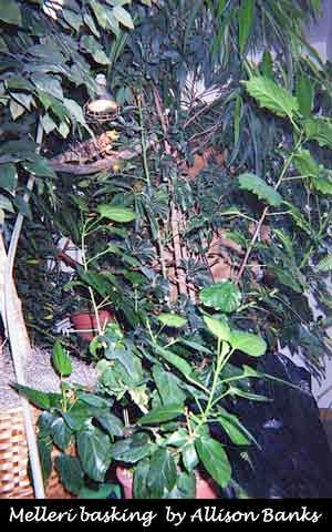 When my first Meller's arrived I used a large wire cage designed for her. But, this cage measured 6 to 7 feet on a side, and I had to basically crawl inside it to clean or adjust anything (you fiddle around with a new cage setup for weeks like I do, right?). I don't particularly care for snagging my clothes on wire or setting knees or hands in fresh insect eater poop even if you do, and my female deliberately perched so far inside the cage it was difficult to spray her thoroughly. She also fought to get out, rubbing her snout and chin on the wire. The cage was irritating, ugly, and didn't suit the tenant. It took up much of the bedroom anyway, so I decided to get rid of the whole thing. With the cage frame gone and the houseplants set in literally the same space, she settled down amazingly well. When rescues two and three arrived the next year there was room for all and happily, they thrived.
