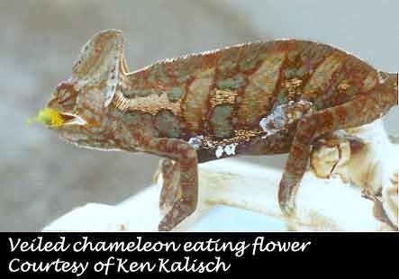 The Veiled Chameleon diet should include some vegetable/vegetation along with insects. It is up to the keeper to provide them with a diet/feeding regime that more closely parallels their wild food consumption. In Yemen there is a very distinct rainy season. In the rainy season there is an increase of insects as well as available water. It is during the dry periods the calyptratus must turn to alternative food and water sources. During the dry periods, it is the ingestion of plant matter that acts as a primary resource for these chameleons survival.