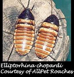 The Dwarf Madagascar Hissing Cockroach (Elliptorhina chopardi) is a good feeder for larger species and its young are also little fat packed morsels! The much larger form of Madagascar Hisser is, in my way of thinking, just to large to use unless your wanting the smaller stages for feeders.