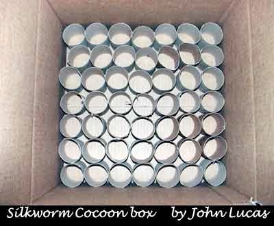 Once they reach 1" in size it is time to clean out all the feces/leftover food/silk. At this size, touching them doesn't seem to bother them much. Remove all the waste and place them back in the clean shoe box. Feed and repeat the process over until the worms are about 3". At this time you will need to transfer them to a cardboard box with paper towel rolls (see Silkworm cocoon box). Put only 75-100 worms per box at a time. Continue to feed, but keep the box closed (dark). The worms will excrete some liquid (this is built up waste), shrink and start to cocoon in the paper towel rolls and top corners of the box.