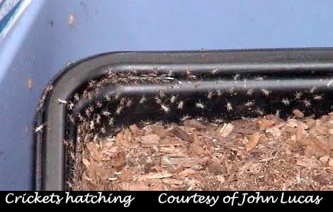 I use the left over plastic containers frozen foods come in (1-2" high), but you can use just about anything small enough to fit inside the cricket box you have laying around. I switch them out at least once a week. (optional; you can cover the egg laying containers with aluminum window screen to keep the males from eating the eggs. The females will still be able to stick their ovipositor through the screen to deposit eggs. I have found that I get plenty of eggs without using the screen. It is your choice.) You will need to spray the dirt with water very well before you place it in with the crickets. When you remove the containers filled with eggs put the containers inside a plastic shoe box with the lid on for incubating. These eggs need high humidity to hatch and can be incubated at room temp. The eggs will hatch in 3-6+ weeks depending on the room temperature. The cooler it is the longer they take to hatch. I had some go as long as two months at 60F, and some hatch in 3 weeks at 80F and some 1 week at 90F. Each container of eggs will contain 1000's of eggs which will hatch into 1/16" pinheads - perfect size! Ever order crickets of one size and get another? I think everyone has had this nightmare. Now that you are breeding your own supply you will have many sizes to choose from!