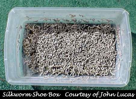 Repeat this every day or every other day as the food disappears. Be careful not to overfeed as it can cause mold to grow especially in the first few weeks when the worms are so small. After about one week with the lid on, remove the lid and transfer the worm to a plastic shoe box with no lid. The worms will not crawl out as long as you feed them. As they grow larger you will need to feed more everyday. They will make silk pathways in the shoe box. It is not mold, but can be confused with mold. It is important to let any leftover food from the previous day dry out as not to cause mold growth. There will also be lots of feces in the bottom of the shoe box. This is nothing to worry about. The less you touch them at under ½" the better success you will have.