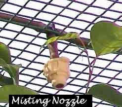 This system will produce a fine mist. The misting nozzles are rated at 0.5GPH (gallons per hour). If you have a hard time locating any of the parts just email me. You should be able to run 20+ nozzles with this system. If you need to run more then that all you need to do is up grade the size of the water line. The screen I use on my outdoor cages is a ½" PVC coated hardware cloth so there are no issues with attacking the nozzles to the cages. If you use a smaller screen just cut a small hole in the screen and slip the tubing through, the fit should be tight. You can also use this system indoors you will just need a place to attach the water timer to.