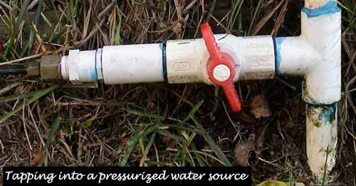 You will need to tap into a pressurized water source. This would be any water pip near by with easy access, or water faucet where you can add an adapter for the water source. The adapter will need to allow for a ¼" OD water line (same type of tubing used for icemakers). Every setup will be different because where I draw my water from will be different from where you do yours. For this reason you are on your own for this part. Home improvement stores will sell adapters for icemaker water lines this is the same thing you will need for this system, you will need to adapt down to ¼" tubing. Remember to turn your main water line off before you cut any pipes, and have a bucket near by to drain the pipe in. You will need a very basic knowledge of plumbing for this part. The photo provided is of a PVC source using the parts in the supply list. (See photo)