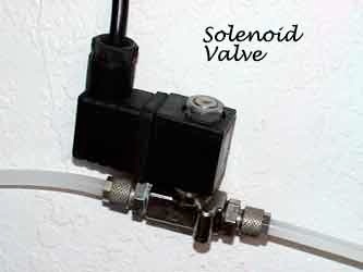 After you have the adapter in place run the ¼" main water line to the misting system. Attach the solenoid valve to the main water line you just ran to the misting system. If you are going to use tap water for your system then you will need to only attach the main water line to the reservoir. If you are using a RO or RO/DI water filter, then you will need to follow the instructions that come with the filter. This will require you to attach the main water line to the filter and then run a waste water line to a drain and the filtered water line to the reservoir. The solenoid is controlled by the float switch, so it will need to be installed near the float switch. The basic way the float switch works is like a light switch, makes and breaks the electrical circuit. The float switch is connected to an extension cord that is plugged in to an electrical source, and the solenoid valve is plugged into the extension cord. (See photo)