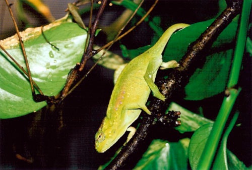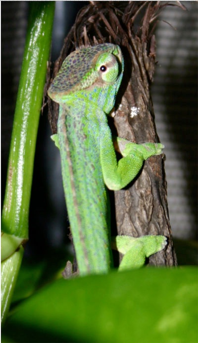 Chamaeleo wiedersheimi is from a rainforest region with high precipitation, lots of vegetation, and cooler temperatures; the enclosure should be constructed accordingly. Enclosures should be constructed of screen for ample air supply, but must contain humidity. Humidity in Cameroon rainforests can range on average from 70-100 percent. In captivity, this can be accomplished through several daily mistings or a humidifier. My enclosures are built into the wall and are made up of plexiglass on four sides, a screened front door, and a screened top. I recommend using a small computer fan to circulate air, though this is not paramount. Chamaeleo wiedersheimi is a rainforest species, so use your imagination while setting up the enclosure, this can be the best part of husbandry! Enclosures can be made as simple or complex as you would like. Plantings can consist of Ficus benjamina, Hawaiian Schefflerra, pothos or phildendron, Antharium, and ferns (this is a small sample of what you can use). Make sure that plants are thoroughly rinsed from any pesticides. An assortment of branches or vines is also desirable. Choose a plant pallet that is both aesthetically pleasing and functional (stay away from toxic plants) and above all have fun!