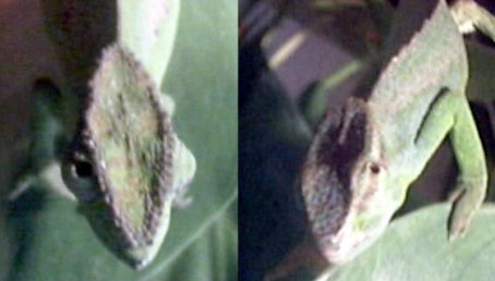 Comparison of parietal crest is Chamaeleo (Trioceros) wiedersheimi perreti (left) and Chamaeleo (Trioceros) w. wiedersheimi (right). Photos courtesy of Chris Anderson