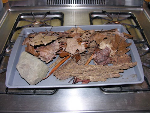 Fixtures such as wood, twigs, rocks, and bark get washed with antibacterial soap (or the 10:1 water/bleach mix) then baked in the oven at 350 degrees for about 30-45 minutes. Leaves get baked in the oven as well but not washed (just a quick rinse before going in the oven). Be careful handling any rocks that have been baked since they will retain a lot of heat for quite some time. Any moss collected outside just gets a good rinse.