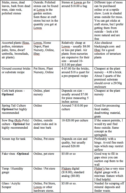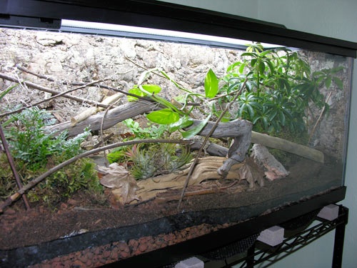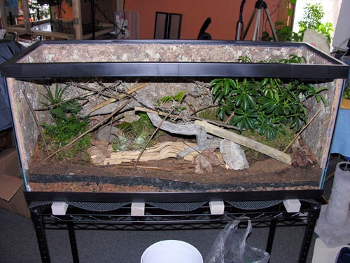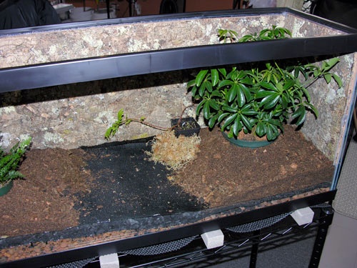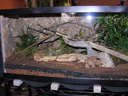 I prefer to use glass enclosures as apposed to acrylic. Even though acrylic is lighter and sometimes cheaper, I feel that it scratches much easier then glass (others will differ with me on this, but both types have their pros and cons). At some point you will have to take a scraper to the walls of the tank to remove mineral deposits and/or debris such as feeder waste; glass seems to handle the scraping much better. Some tanks may come with a draining hole at the bottom while other keepers have installed these themselves. I have never felt the need for one, but this feature may be useful if the enclosure became over watered by a broken misting system or by some other means. Keep in mind that many tanks with a draining hole are acrylic. You will need special tools to install one in a glass enclosure.