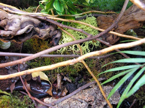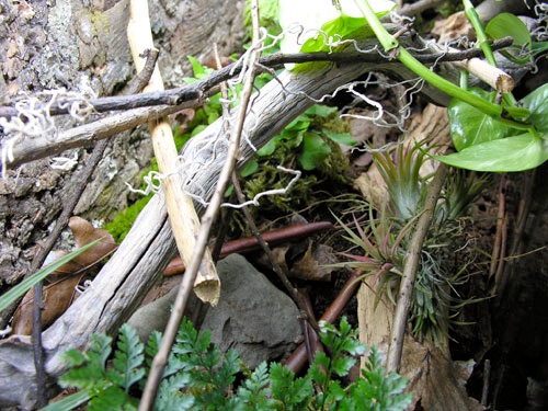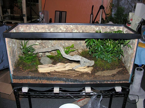 Now put the large fixtures back in the spots where you designated them prior to adding the top substrate. When it comes to where to position things like vines, sticks, small rocks, leaves, cork pieces, moss, etc., there really isn't a wrong or right way to do it. You just need to be creative, look online at other keeper's enclosures to get ideas. Here are some tips: