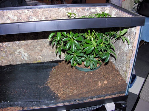 At first glance it would seem that a lot of top soil is needed to hide the plant pots. This can be overcome by surrounding the plant pot with some sphagnum moss. Soak the moss in water then squeeze out about 70% of the water. Surround the plant pot with the moss then lightly pat some substrate over it. This will create "mini slopes" around the plant pots which adds to the contour of the landscape. You can also hide the very tops of the plant pots with some green moss. The final layer of soil should be around 2-4 inches deep - lightly packed down, and I mean light. Packing it down too much will prevent water from draining and/or evaporating. I have read where some keepers don't like coconut fiber since its sticks to the chameleon's skin and tongue. True, but patting it down helps. Also keep in mind that when the enclosure is complete, there will be bark, leaves, rocks, cork etc. hiding a good amount of the substrate.