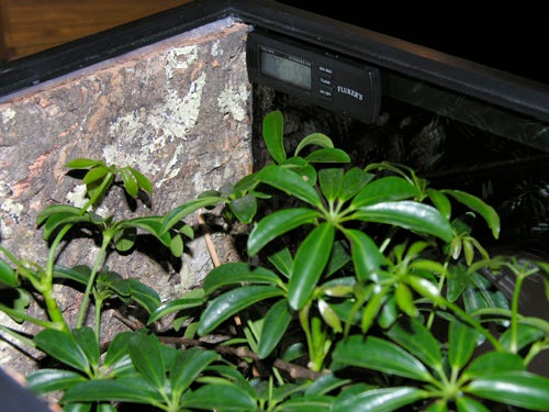 The timer should be set for a 12 hour light cycle for species that live on or near the equator. Oh, and don't forget to put in the temp/humidity gauge. If it's a large enclosure, I like to put a couple in - one in each far corner.