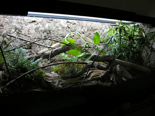 Many keepers use "used" repti-sun 5.0 bulbs or new 2.0 bulbs. It's uncertain whether or not stump-tailed chameleons utilize UVA/B rays, but it's best to have a bulb that produces them to benefit live plants. I have been using new 5.0 bulbs in some of enclosures with no problems. If need be, there are plenty of areas where the chameleons can seek cover from the UV rays. I will be using a new repti-sun 2.0 bulb for this enclosure.