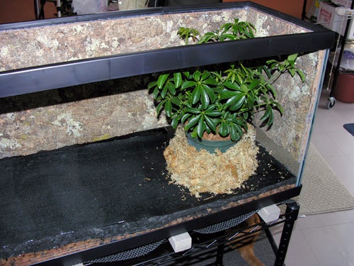 Now is the time to get an idea where the plants and large fixtures such as drift wood and large rocks should be placed. If you decide to have a basking bulb then make sure the plant nearest to it can handle the light and heat. If more than one chameleon is being placed in the enclosure then the less line of site the better - so no "open areas" where chameleons can easily see one another. Once the positioning is figured out, remove the large fixtures but keep the plants in place. Plants shouldn't be tall enough to the touch or be close to the screen top. Chameleons will most definitely attempt to climb on the screen, so trim plants down if necessary.
