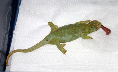 This female Chamaeleo (Trioceros) jacksonii xantholophus started being unable to retract her tongue during treatment for a temporal gland infection. She was initially treated hoping for her tongue to recover but it ended up being amputated. She is currently recovering well. Photo Courtesy of Chris Anderson