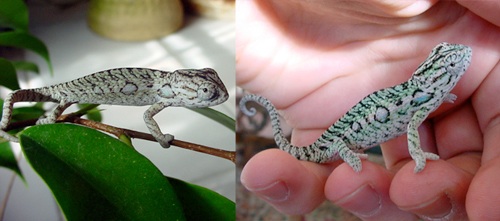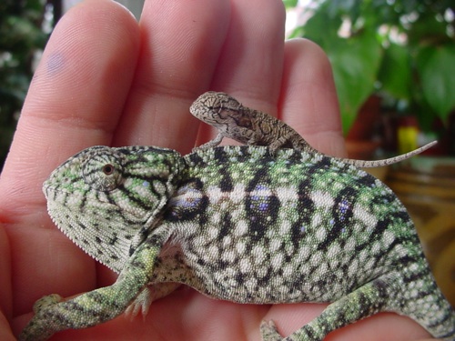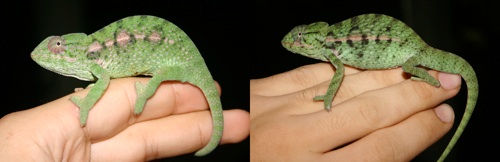 Wild-caught carpets are delicate and often carry internal parasites. They require a lot of hydration for the first month with regular showers and drippers combined with spraying. Fecals should be performed by a vet as soon as possible to see if treatment is necessary. The chameleons should be allowed to fully rehydrate, and acclimate to the new surroundings before being subjected to medications, in order to prevent further stress on the animals' bodies. Try to select juveniles or smaller adults when choosing from imported specimens, particularly in the case of females. Most of the time, wild-caught adult females are gravid, having bred before capture or during the holding process. I've had larger imported females acclimate successfully and lay eggs, only to have all of the eggs go full-term and die stillborn (because the babies were too weak to exit the eggs?). When compared to captive-bred babies incubated in a similar manner, there were distinct morphological differences. Upon opening the eggs, the wild-caught's still-born neonates were considerably smaller in size with dome-shaped heads. This happened with two consecutive clutches by the same female. This female was very large and appeared older when received as a fresh import. I can only speculate as to the causes, but much evidence exists to believe that the health and condition of the female greatly affects the resulting hatchlings (James Amirian-pers. Comm.). By targeting smaller females you can hope for a younger individual that has laid less clutches, still possessing positive reproductive capabilities.