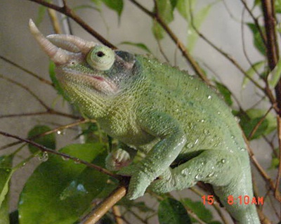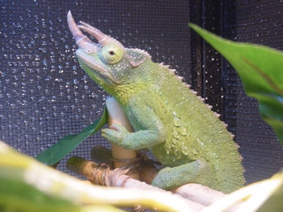 It was August of 2004 and my birthday was on its way; I wanted a new pet. I wanted something cool, different, something no one else I knew, had. No sooner did I enter PetSmart, and find exactly what I was looking for. In a small glass aquarium were four chameleons. Two Veiled chameleons, and two Mt. Kenya Jackson's chameleons. After much personal deliberation, I purchased a male Jackson's because I thought his horns were rather interesting. The sales associate assured me a glass aquarium, dripper, bark substrate, water bowl, and a basking lamp were all that I needed. I quickly purchased these necessities and went home to set up my new chameleon's habitat.