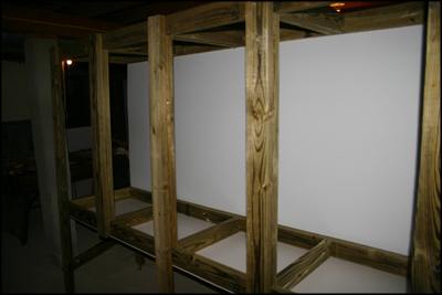 One side of vertical frame supports and legs attached to the double leveled enclosure unit.