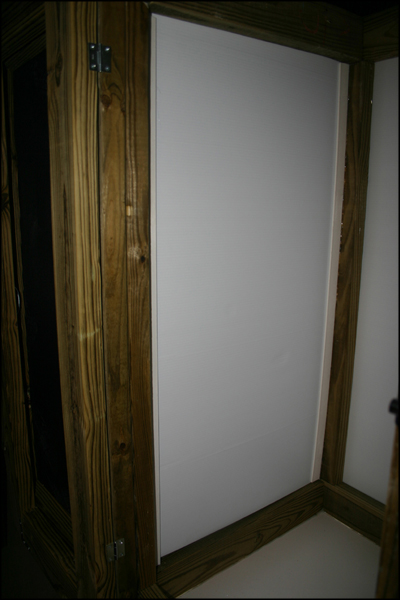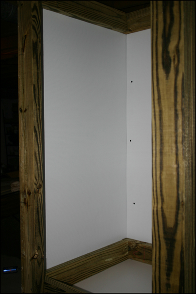 A 4'x8' piece of corrugated plastic is placed between the frame and the vertical supports to create a solid back to the enclosure.