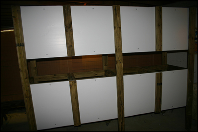 At this point, you should start to build doors. After carefully measuring for variation in dimensions, you should start building your doors at the appropriate size. Theoretically, the space for each door on the single level enclosure unit should be about 4'x19.5” and the space for each door on the double level enclosure unit should be about 2'x19.5” but you should measure to be sure. The frame can be connected using L-brackets and then a diagonally inserted screw in each corner for added stability.