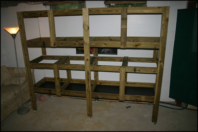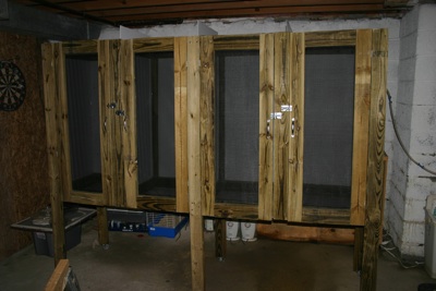 We wanted to be able to have large enclosures without wasting space when they weren't needed and we wanted to have small enclosures without being limited to only small species. We also wanted to introduce pairs for breeding without the stress of removing one of the two from their territory. It became obvious that we could accomplish this if we had large caging units with removable dividers to partition the unit into smaller enclosures if we so desired. The only problem was how we were going to do it so that the enclosure was sturdy, didn't cost too incredibly much to build and would be easy for people to locate supplies for to replicate. We came up with two designs that could be used for different purposes and I went off to build these two enclosures for myself.