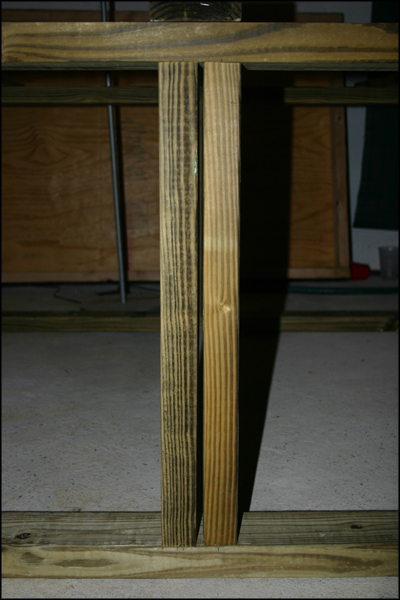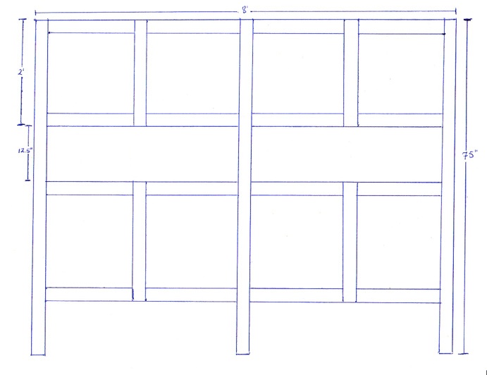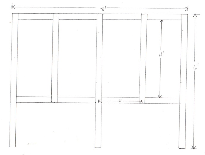 From the above plans for the frames of the two enclosure units we designed, you can see that we decided 8' long 2x4s would be a sturdy, affordable and consistently available material to base our cages on. At this point, we realized that for such an enclosure to work properly, it would be very important to find straight 2x4s which can be difficult in untreated pieces. Further, untreated pieces would need to be stained and sealed to protect from water damage. For this reason, we decided to use pressure treated 2x4s.