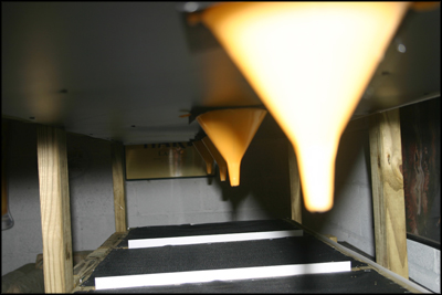 Each funnel should then be attached to the bottom of the expanded PVC so that it covers the 5 holes drilled into the center. The funnel will prevent water from running along the under side of the PVC and dripping anywhere you don't intend it to. You'll notice that they should line up down the length of the enclosure.
