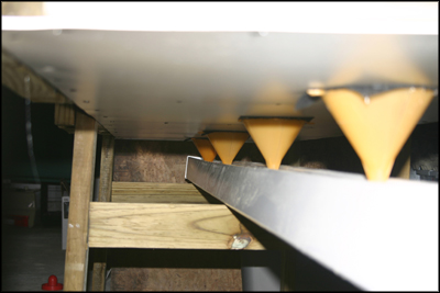 Funnels attached to the bottom of the expanded PVC around the drilled holes line up down the length of the enclosure.