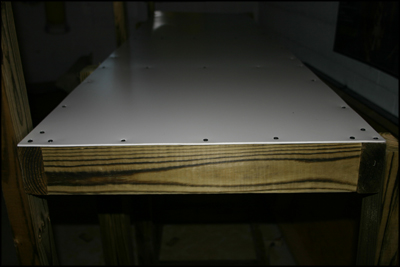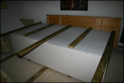 Once you've attached the boards to support the frame during flipping, you should flip the enclosure so that it is standing upside down on its top. This will allow you to easily attach a 2'x8' piece of 1/8” expanded PVC board to the bottom.